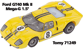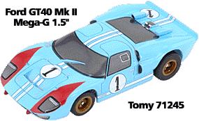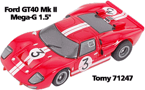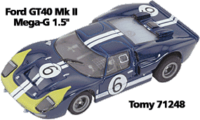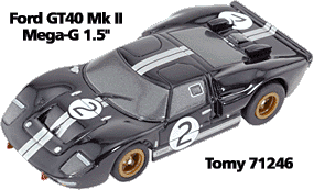 All of these new Tomy AFX cars ride on top of the brand new 1.5" wheelbase Mega-G chassis. The chassis is pictured above and, as you can see, features a slightly shorter wheelbase than the DP01 Formula Mega-G cars launched last year. Otherwise, it's the same car but utilizes a new body clip so full-width bodies can be snapped onto the Mega-G chassis. All of these new Mega-G Collector Series cars are in stock and available for immediate shipment. Note: Don�t forget all of these beautiful GT40 bodies, as well as the Daytona Coupe, will snap directly onto a BSRT G-Jet making for even more realistic racing. 71245 - Mega-G 1.5" Ford GT40 Mk II #1 (Miles) 71246 - Mega-G 1.5" Ford GT40 Mk II #2 (McLaren) 71247 - Mega-G 1.5" Ford GT40 Mk II #3 (Gurney) 71248 - Mega-G 1.5" "Clear" GT40 Mk II #6 (Andretti) 71249 - Mega-G 1.5" "Clear" GT40 Mk II #8 (Whitmore) 71250 - Mega-G 1.5" "Clear" Daytona Coupe #59 |