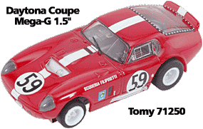 Collector Cars are Here! All six of the brand new Tomy AFX Mega-G Collector Cars are now in stock. These cars include the new 1.5-inch wheelbase Mega-G chassis, complete with new body clip, underneath these very collectible Ford GT40's and Cobra Daytona Coupe. The Miles, McLaren, Gurney, Andretti, and Whitmore GT40's are replicas of the cars that took part in the 1966 LeMans 24-Hour Race. The red Cobra Daytona Coupe is a new offering from AFX featuring clear windows and interior detail. The first three Ford GT40 bodies listed are re-issues of the Shelby America team cars run at LeMans in 1966. The light blue and black GT40's finished first and second that year but not without a controversial finish. Ken Miles and Denny Hulme piloted the #1 car and thought they had won in a top-3 dead-heat finish. The French officials thought otherwise and declared the black #2 car, driven by Bruce McLaren and Chris Amon, the official winner since they had started the race further down the grid and, therefore, covered more ground. The red #3 Shelby-prepped GT40 was driven by American's Dan Gurney and Jerry Grant. They led much of the race before retiring during the 18th hour.