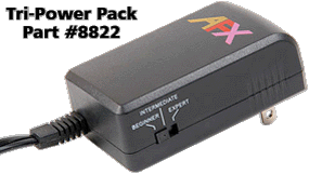Pack with 3 Voltages While not quite carrying the same weight as the new Mega-G car, AFX�s Tri-Power Pack is still an important new product release. Ever since Aurora stopped production of their two-screw transformer power packs decades ago, all AFX sets have been down on power. The most common complaint is that one car will speed up when the other car comes off. While the voltage rating was high, the problem was always a lack of amperage. That�s all been taken care of with their new Tri-Power Pack. Of even more importance, there�s now three different voltages you can set the power pack to including 22 volts, 12 volts, and 8 volts. At all three voltages, there�s a full 1-amp on hand, just like the original Aurora two-screw transformers. With a standard Tomy terminal track plug attached to it, HO enthusiasts will now be able to switch between running magnet cars on 22-volts and BSRT�s extremely popular G-Jet on 12-volts. It�s as simple as flipping a switch. The new Tri-Power Pack is a very important new product for the entry level racing crowd. The Tri-Power Pack is part #8822P and is now IN STOCK ready for immediate shipment. |